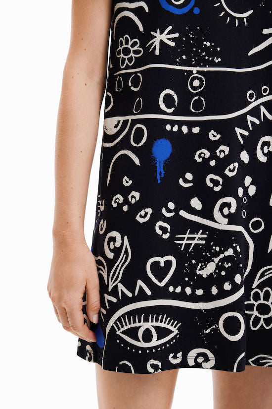 En pur coton noir, la robe Desigual 22WWVK70 est intégralement imprimé de symboles en contrastes.