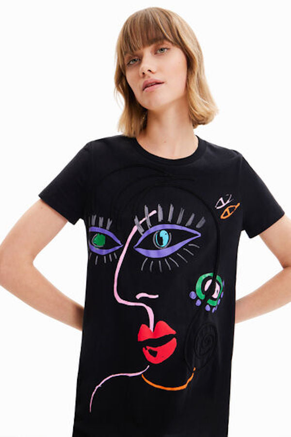 La célèbre marque Desigual vous présente sa robe courte Malua 23SWVK89 réalisée en coton noir enjolivé d'un visage imprimé en relief avec paillettes et d'un cordon brodé.