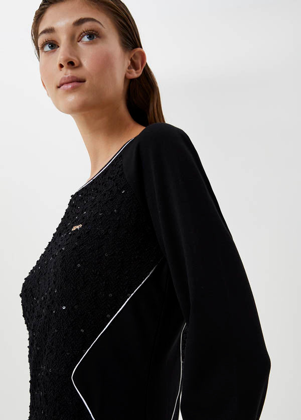 Élégante, la robe tout droit sortie de la ligne sport de Liu Jo est ornée de broderies et de paillettes sequins.