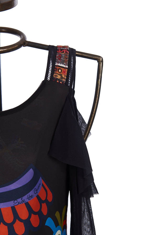 La robe Save the Queen est munie de manches en tulle, de bretelles en passementerie, et un large col arrondi.