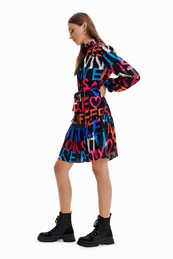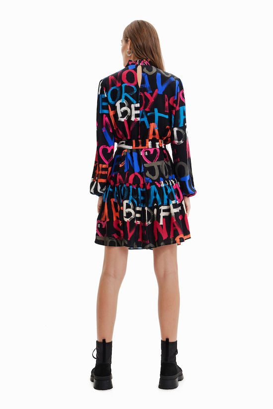 Réalisée en viscose noir, Desigual joue l'originalité avec sa robe courte 22WWVW10 rehaussée d'un imprimé de messages colorés.
