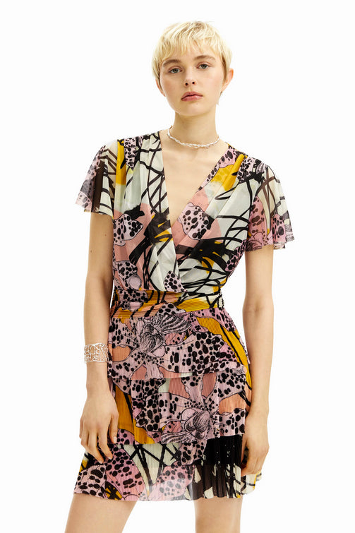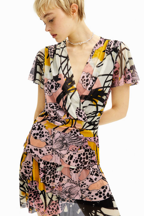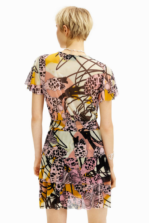 Robe courte avec petites manches col cache coeur et imprimé orchidées