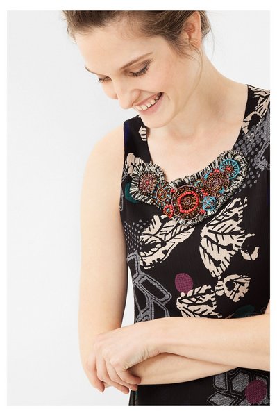 La robe Desigual by C Lacroix 67V2LA5 Black est doublée, elle est sans manches, son encolure arrondie et elle possède un très joli ornement dans le décolleté fait de fleurs en tissu à franges, de perles de différentes formes et couleurs.