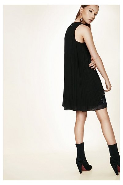 Robe fluide chasuble Desigual 71V2GG5 modèle Besalu superposé avec tissus plissé et effet clouté sur le bas.