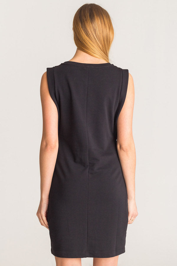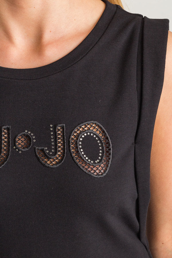Avec des baskets et un cabas, vous voilà prête pour un après midi shopping avec la robe courte Liu Jo sans manches, col rond, coupe droite et son inscription ajourée sur la poitrine.