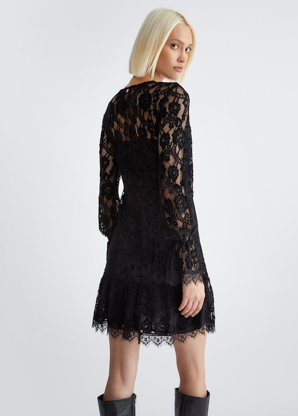 Fabrication Italienne pour cette robe MF3393J460422222 toute en dentelle de la maison Liu Jo, manches longues évasée au poignet et encolure V
