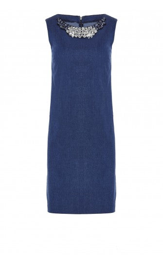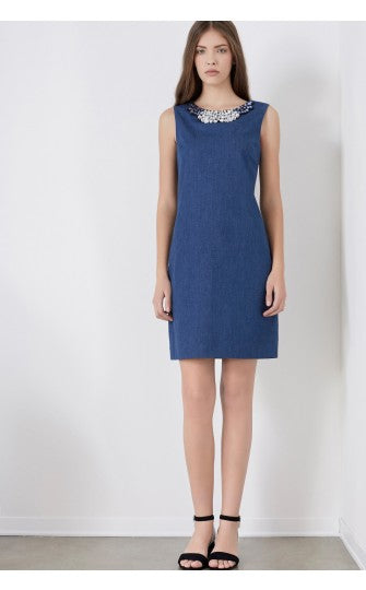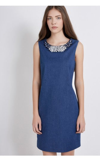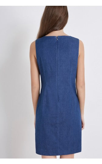 Robe Liu Jo fourreau sans manches en DENIM LÉGER avec encolure bijou et fermeture par zip au dos.