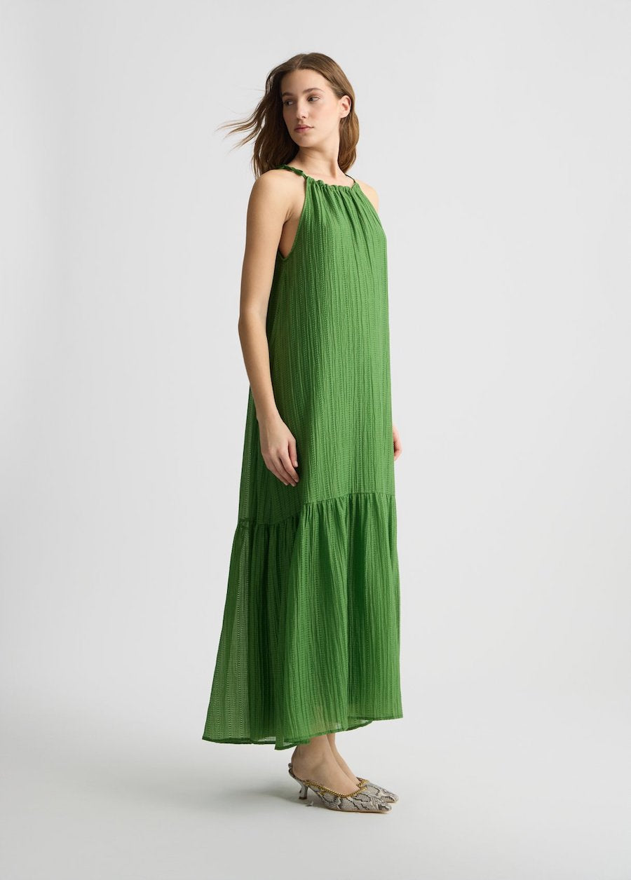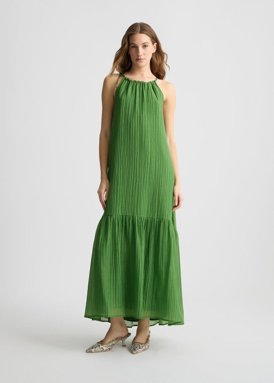 Bretelles et col rond pour cette robe longue fluide au bas volanté