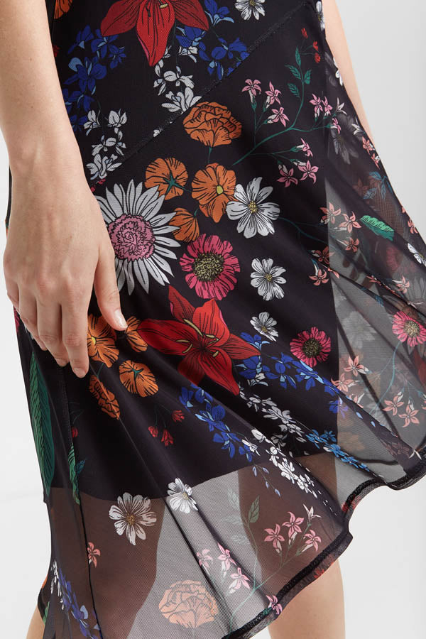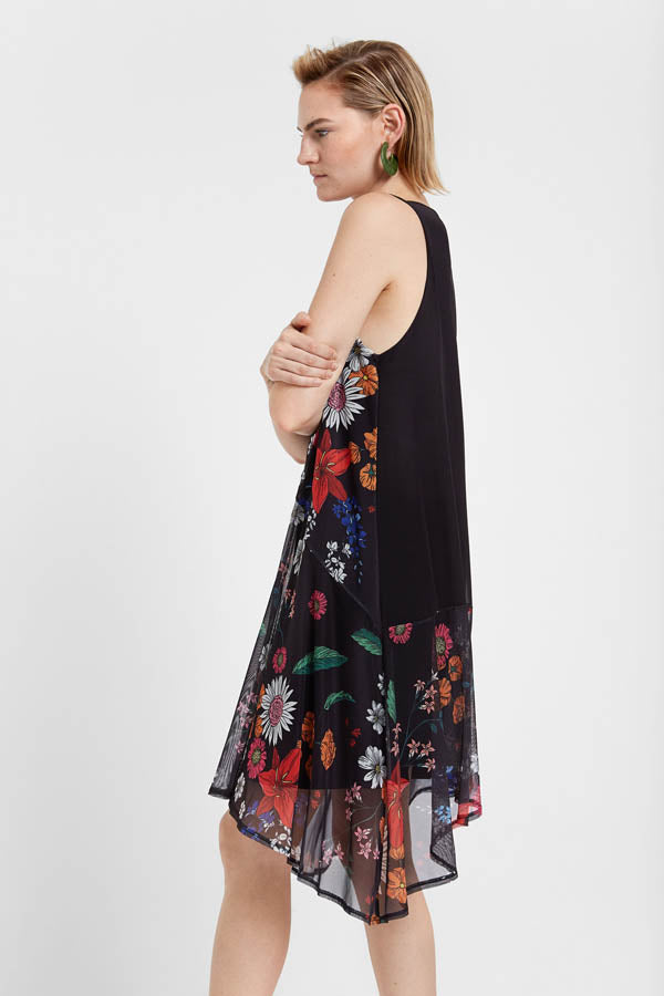 Fluide et légère, la robe Desigual est en viscose mélangé. Elle est sans manches avec un col arrondi et nous offre une robe en tulle avec un imprimé de fleurs colorées et une base asymétrique.