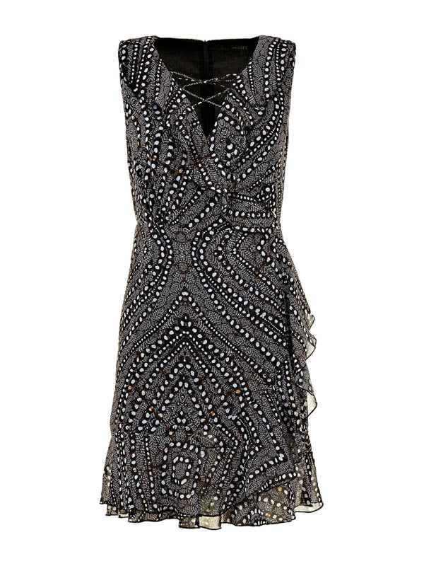 La robe Guess CRISTABELL est présenté avec un imprimé noir et blanc avec un col en V avec laçage et volant qui part du col jusque sur le côté.