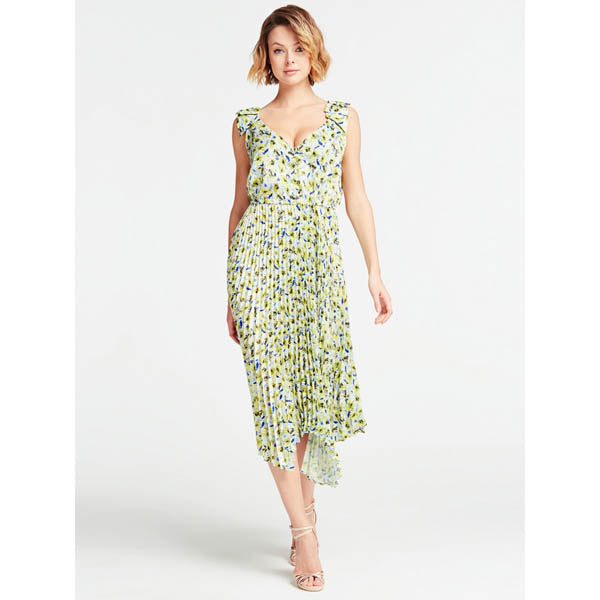 La robe Guess est sans manches et nous offre un décolleté en v, une jupe plissée et asymétrique.