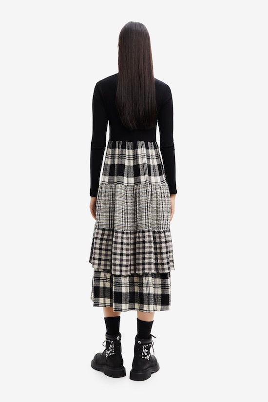 La robe Desigual 22WWVW36 pour femme est munie d'un col roulé, de manches longues unies et d'une jupe à volants embellie de différents imprimés à carreaux.
