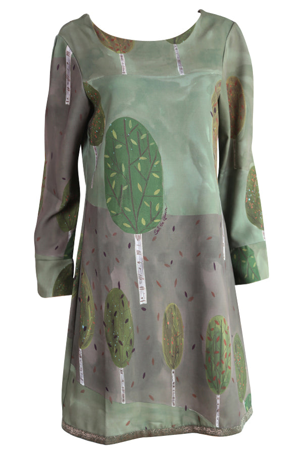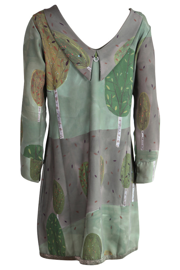 Robe nature de la maison de couture Italienne Save the Queen portant la référence 4130 avec des arbres et la fôret.