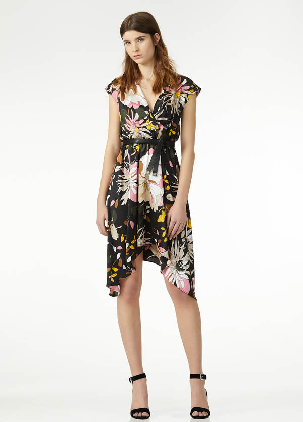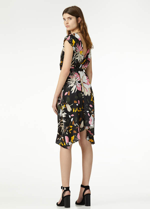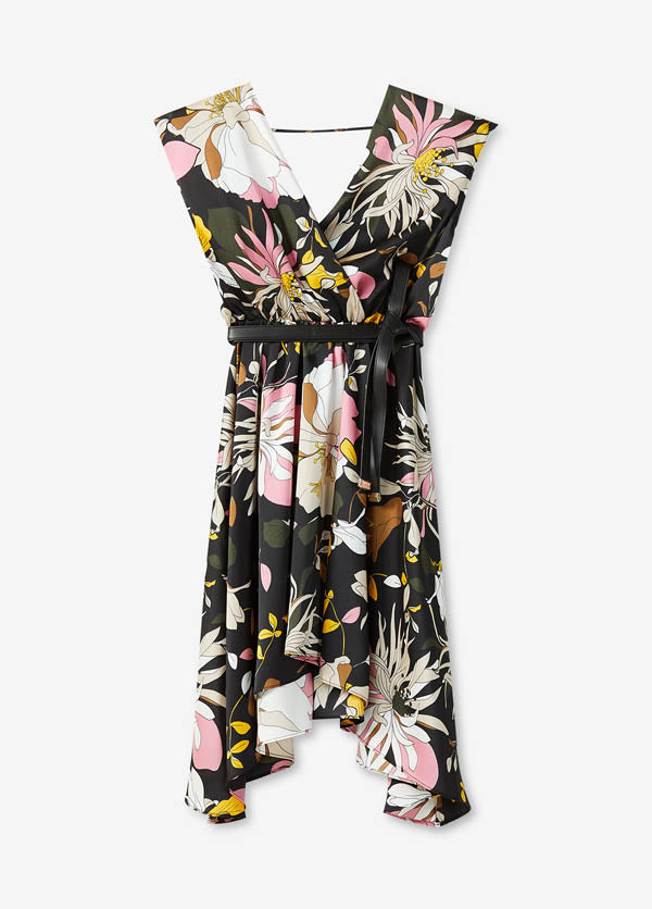 La robe Liu Jo nous offre un imprimé de fleurs colorées sur un fond uni marron, un décolleté en V, une base asymétrique et une ceinture contrastante.