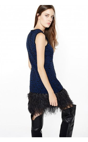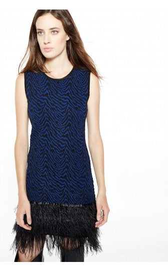 Robe Liu Jo sans manches en maille JACQUARD ZÉBRÉ bleu et noir, elle est sans manches et entièrement doublée.