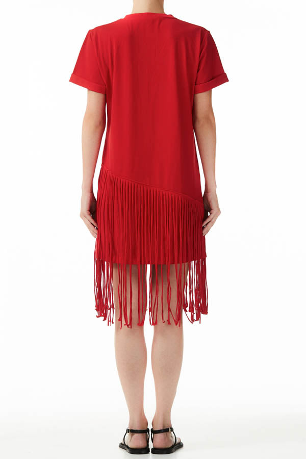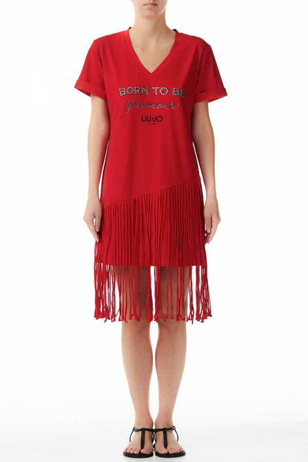 Agréable à porter, Liu Jo nous offre une robe à manches courtes avec col en v, applications de pierres sur le devant, et jupe à franges.