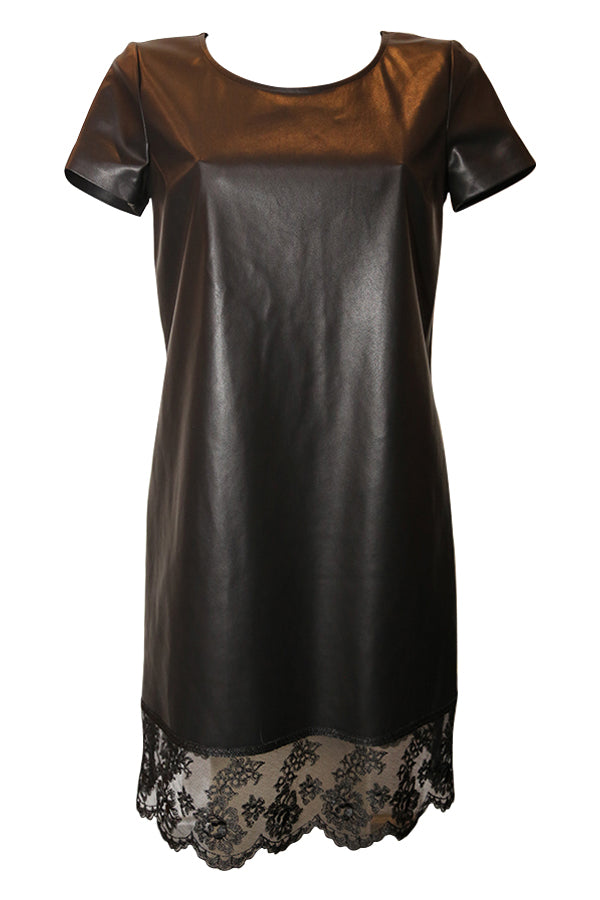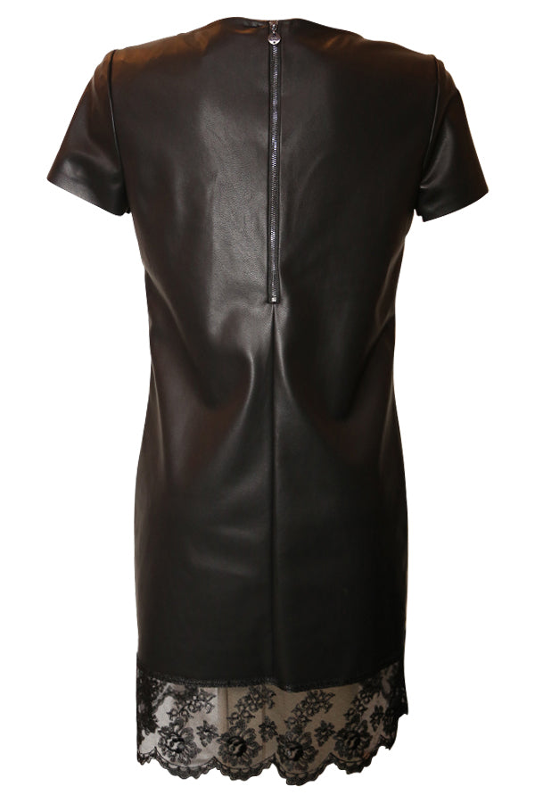 Du simili cuir noir et une finition avec bord dentelle pour la robe LIU JO, elle possède un col rond, des manches courtes, une coupe droite et elle se ferme au dos avec une fermeture éclair apparente et nous propose une doublure.