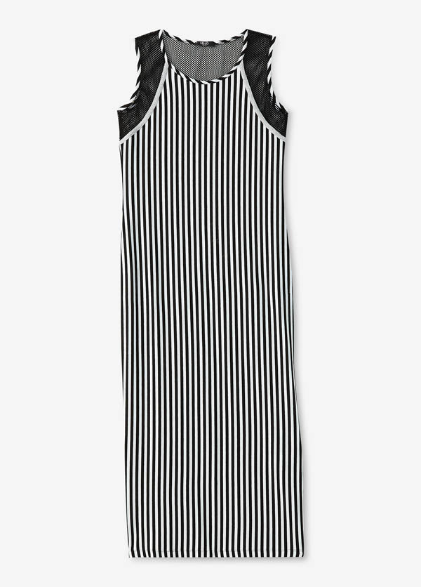 La robe Liu Jo nous offre un imprimé de rayures verticales noires et blanches, un col rond et des inserts en mesh sur les bretelles et le dos.