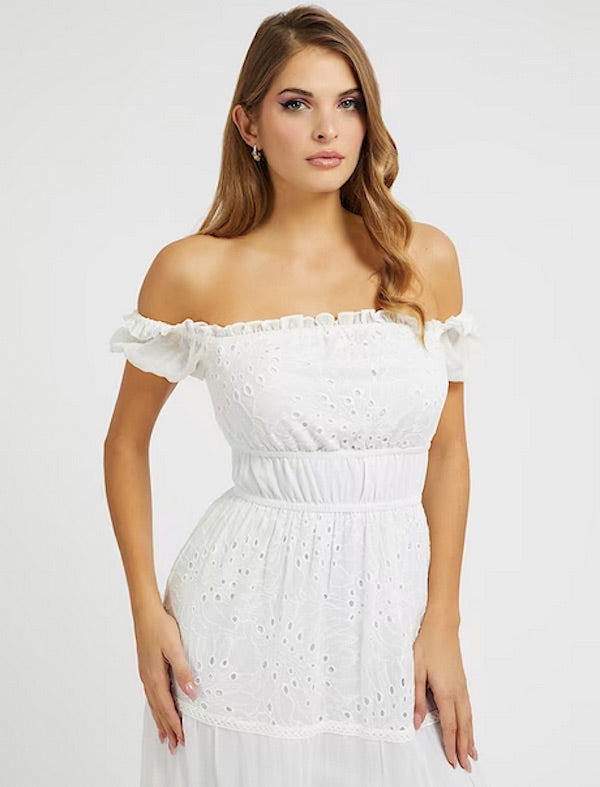 Robe longue brodée à col bardot Guess W3GK51 WFDR2 G011 modèle Zena