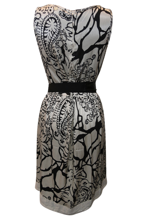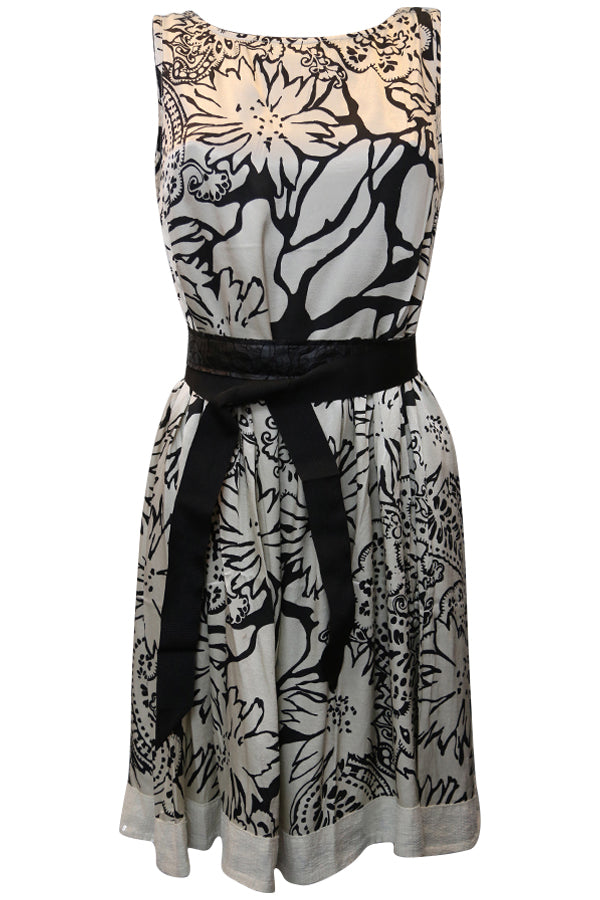 Un tissu 100 % rayonne blanche avec un MAGNIFIQUE imprimé floral dessiné de couleur noir et une ganse blanche ornée de sequins à la base.