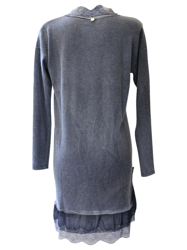 Une maille tricot fine de couleur bleu gris bordée de tissu fin et dentelle nous donne la robe Nana Nucci OA5.