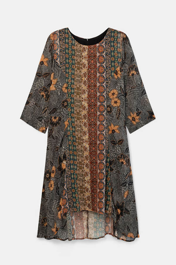 Avec son style boho, la robe Desigual nous offre de magnifiques imprimés de frises aux couleurs automnales orné de lurex.