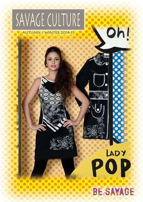 Une coupe légèrement cintrée très facile à enfilée pour la robe Savage Culture 27042 modèle Gretel, l'arrière est uni noir avec un petit rappel de fleurs géométrique dans le haut.