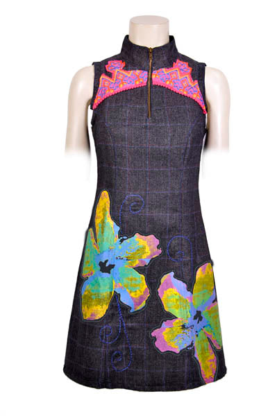 Robe Savage Culture en tissu à chevrons et quadrillés rose et bleu en laine et acrylique avec surpiqûres bleu turquoise, empiècement florales colorées et broderies dans le haut du buste.