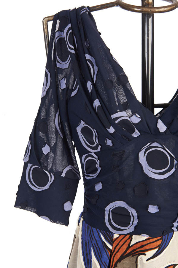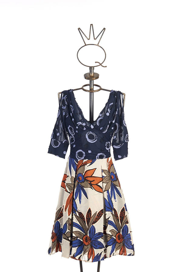 Féminine et élégante, la robe Save the Queen nous offre de magnifiques imprimées, des bulles pour le haut et des fleurs pour la jupe avec plis. Elle est munie de manches 3/4 et d'un décolleté profond.