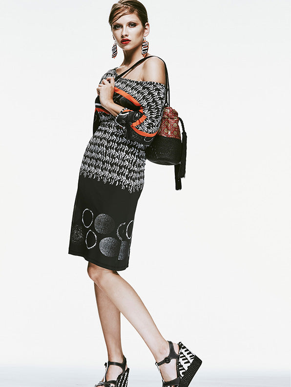 Robe Save The Queen fluide noir imprimé de motifs noir et écru d'aspect plissé très TENDANCE et sphères noirs à bords blancs et grises avec bande rouge au niveau de la poitrine et manches.