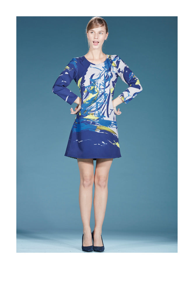 Robe Save the Queen en polyester et élasthanne avec une coupe trapèze, elle dispose d'imprimés à motifs d'aspect peinture abstraite bleu azur, bleu roi, blanc et jaune.
