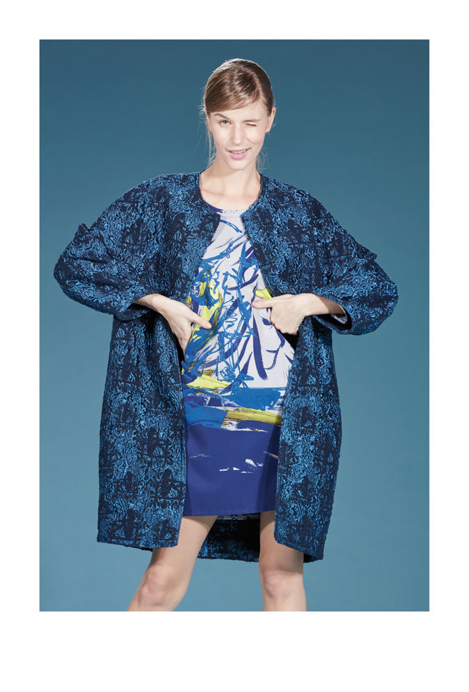 La robe du créateur Marco Fantini est pleine astuce c'est deux robe en une, elle est double face, la face cachée est orné de petits d'imprimés géométriques noir sur fond gris clair.