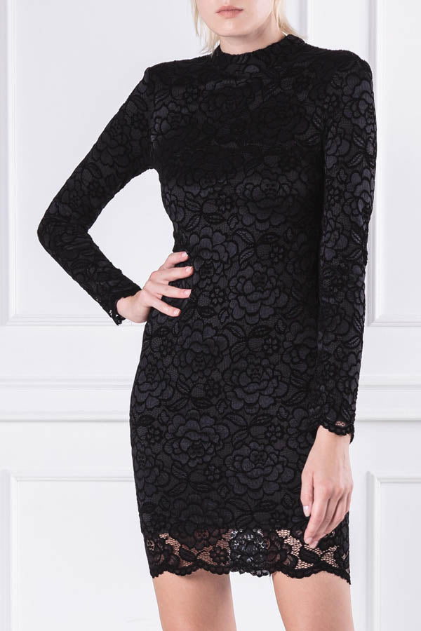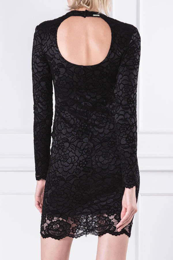 Total look glamour avec la robe Guess! Elle est en dentelle avec des motifs floraux, et possède des manches longues, un col légèrement montant et ouverte dans le dos.