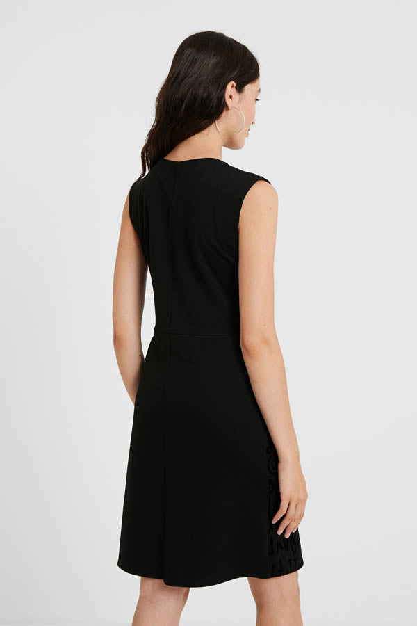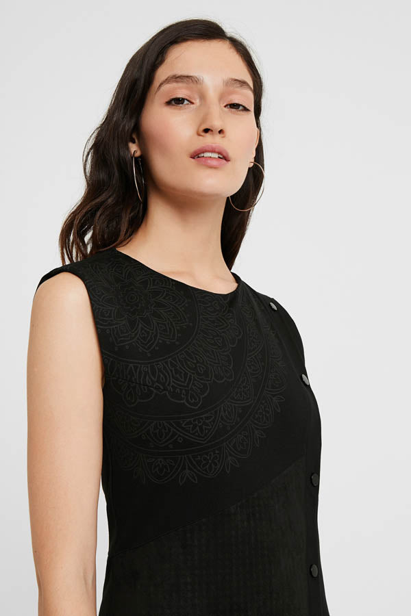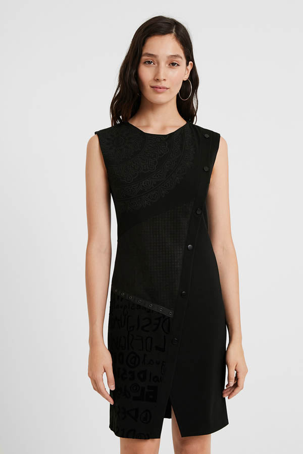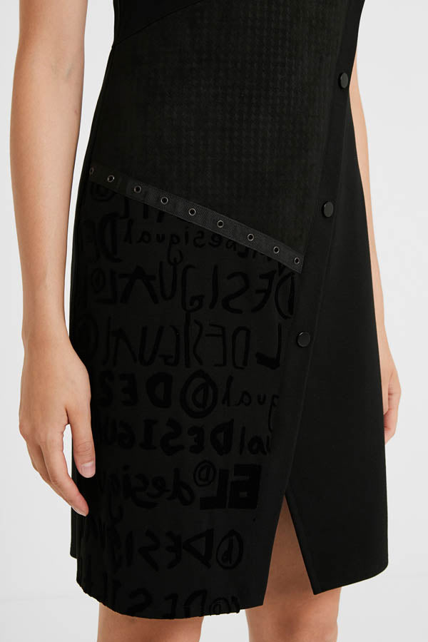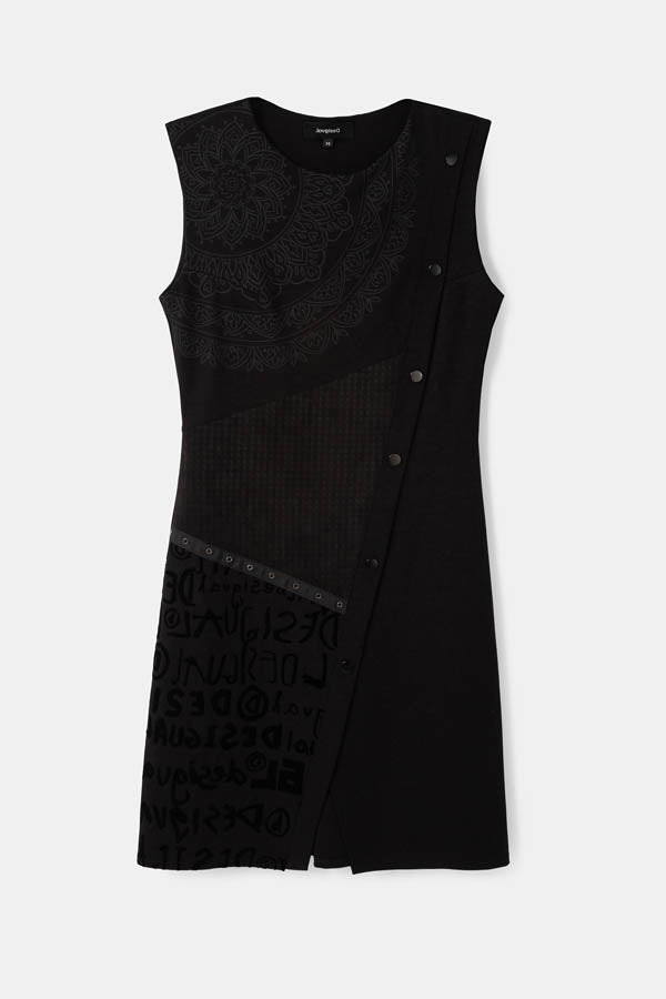 La robe Desigual est sans manches avec un col rond, un fermeture diagonale et nous offre un imprimé de mandalas, un insert imprimé pied-de-poule et le logo floqué en velours.