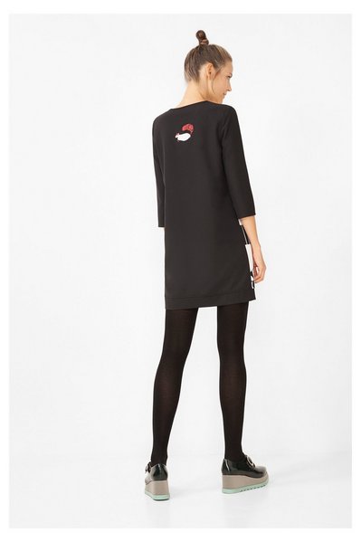 Les manches de la robe Desigual 67V20D2 Katia sont 3/4, dans la base une bande noire avec une plaque avec le logo de la marque, elle dispose d'une encolure arrondie.