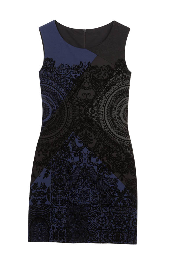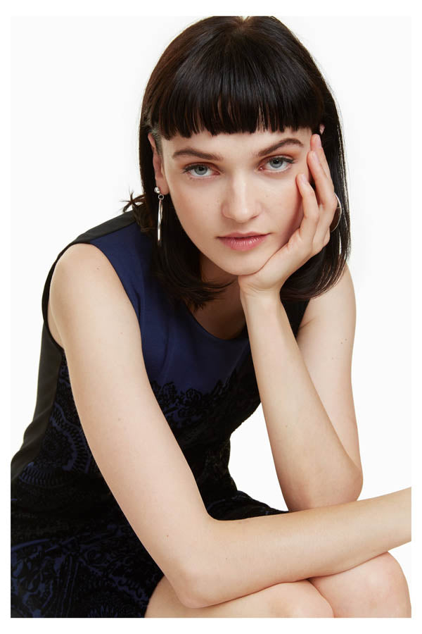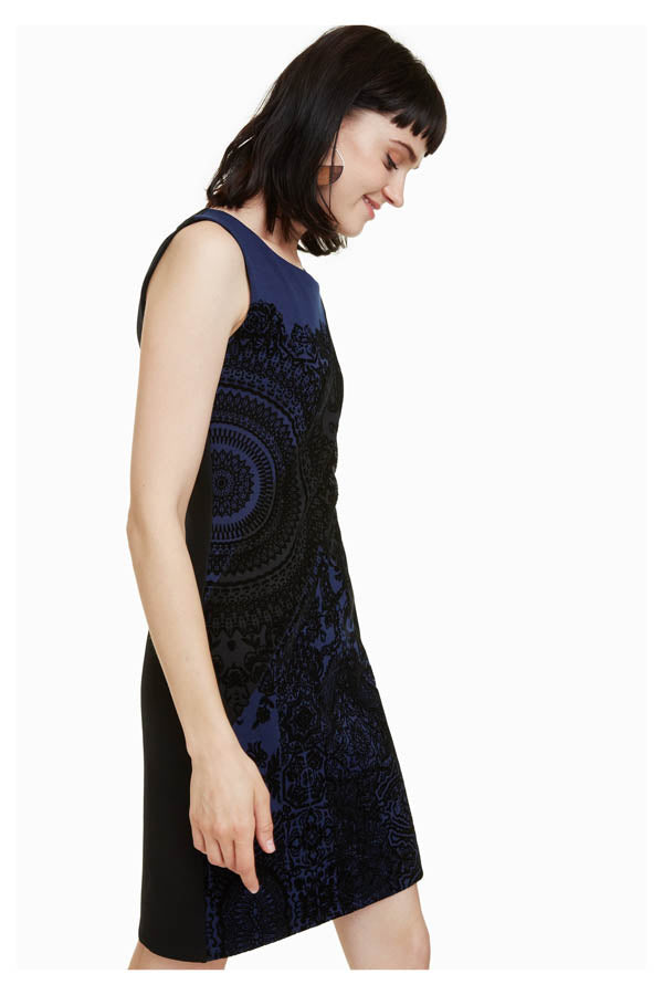 Avec des imprimés noir sur bleu de mandalas et de fleurs sur le devant, et un col rond, la robe sans manches Desigual se portera à toutes occasions.