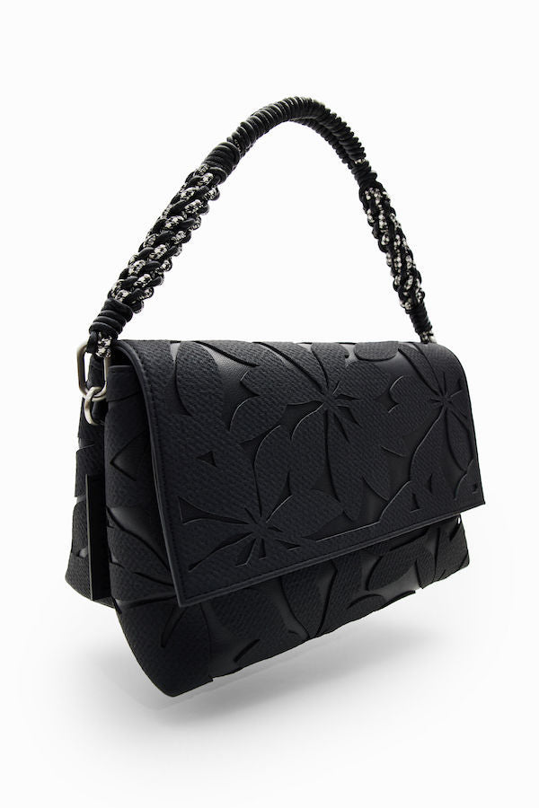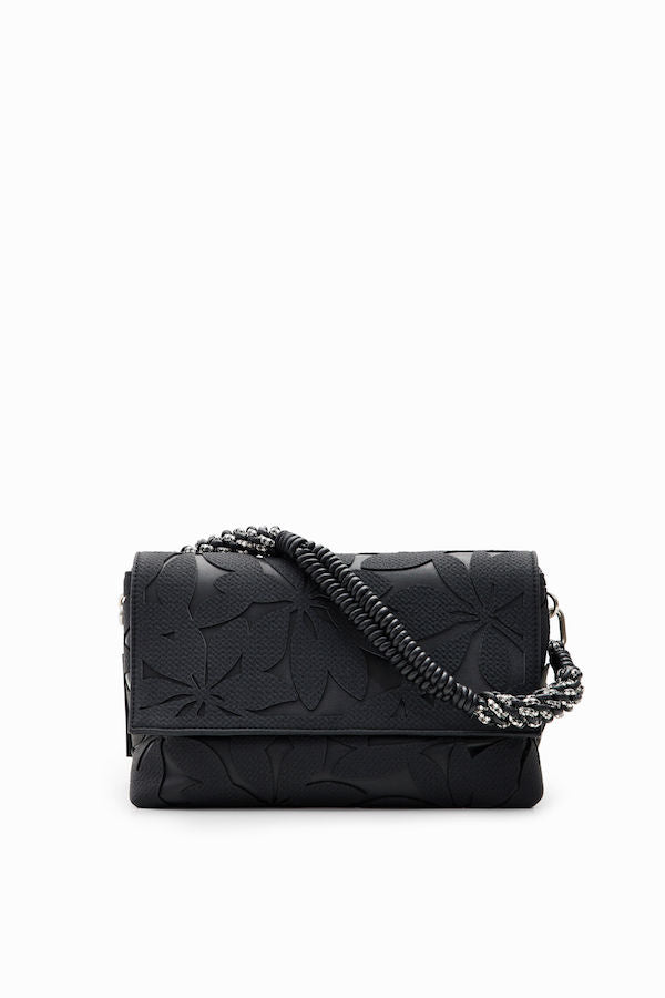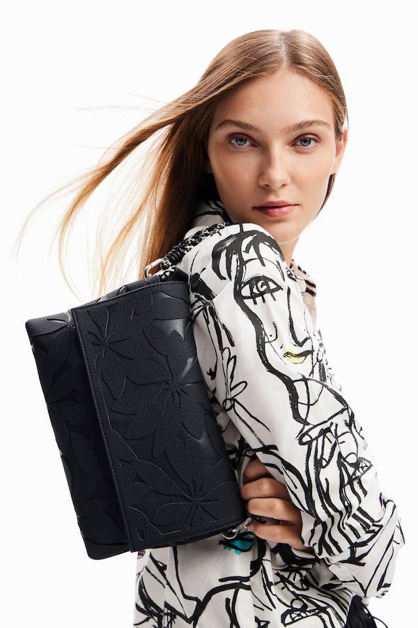 Sac à bandoulière de taille moyenne effet cuir de la marque Desigual 23WAXP602000U, avec des fleurs estampées en relief ton sur ton, plusieurs anses, poches et compartiments.