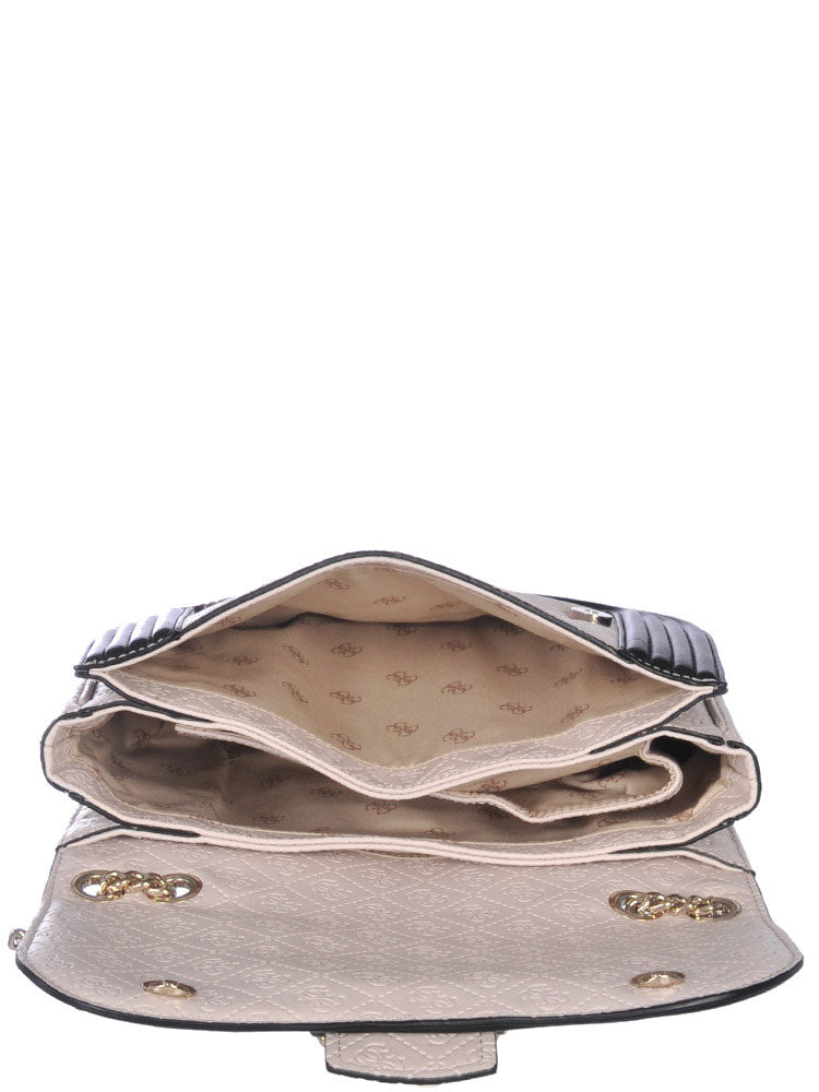 Sac à main Guess petit format avec poignées coulissante pour laisser place à une longue bandoulière pour porté travers , fermeture par top magnétique.