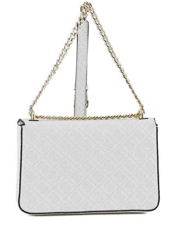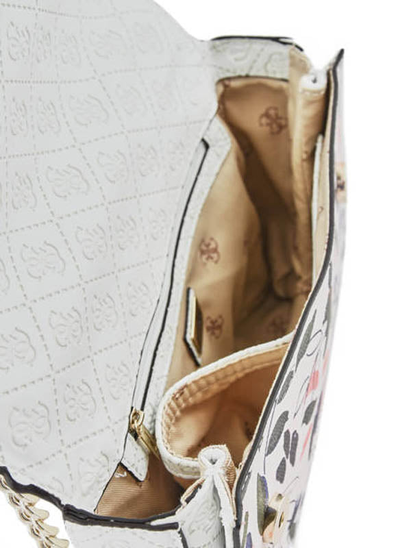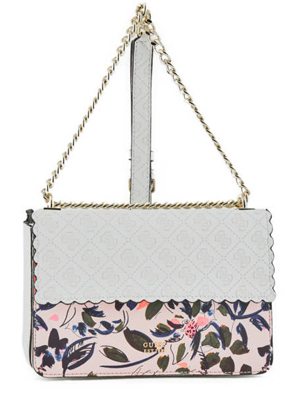 Guess signe l'originalité avec son sac imprimé fleuri sur le devant , sa fermeture par rabat et boutons pressions, sa bandoulière avec chaîne et ses motifs logotés sur l'ensemble du sac.