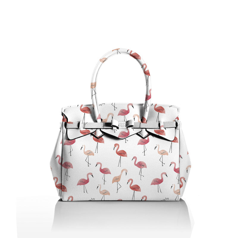 Le sac Save My Bag vous offre un magnifique imprimé de flamant rose et se compose de 2 poignées, d'une poche intérieure et une fermeture boutons-pression.