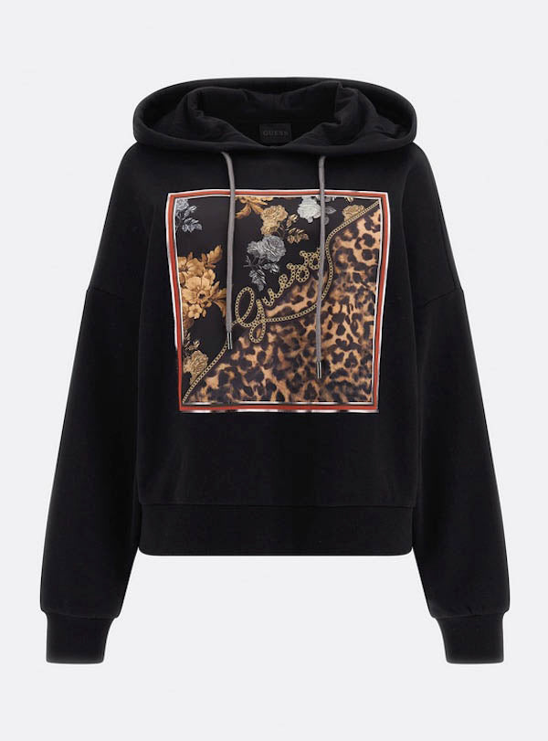 Créé en coton mélangé noir, le sweat à capuche W2BQ10 Guess est enjolivé d'un cadre avec une chaîne dorée et un imprimé animalier.