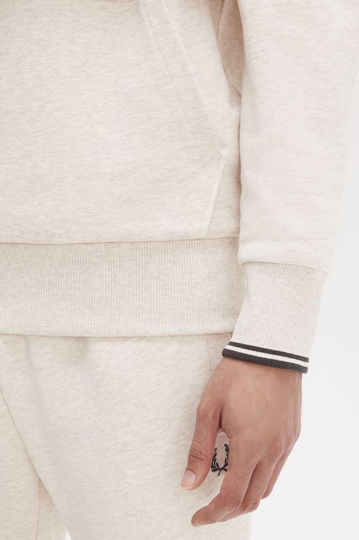 Modèle à capuche avec double liseré aux poignets et logo Fred Perry ( la courone ) brodée sur la poitrine