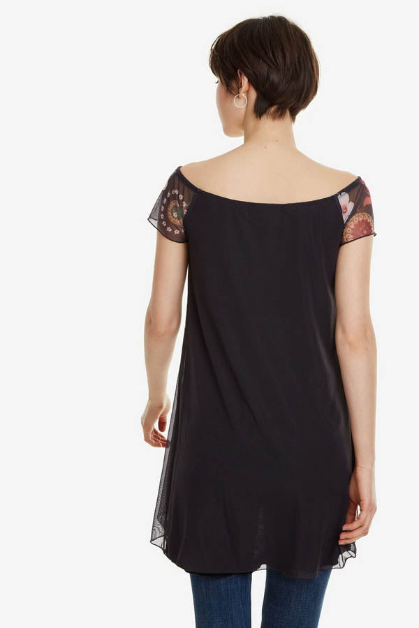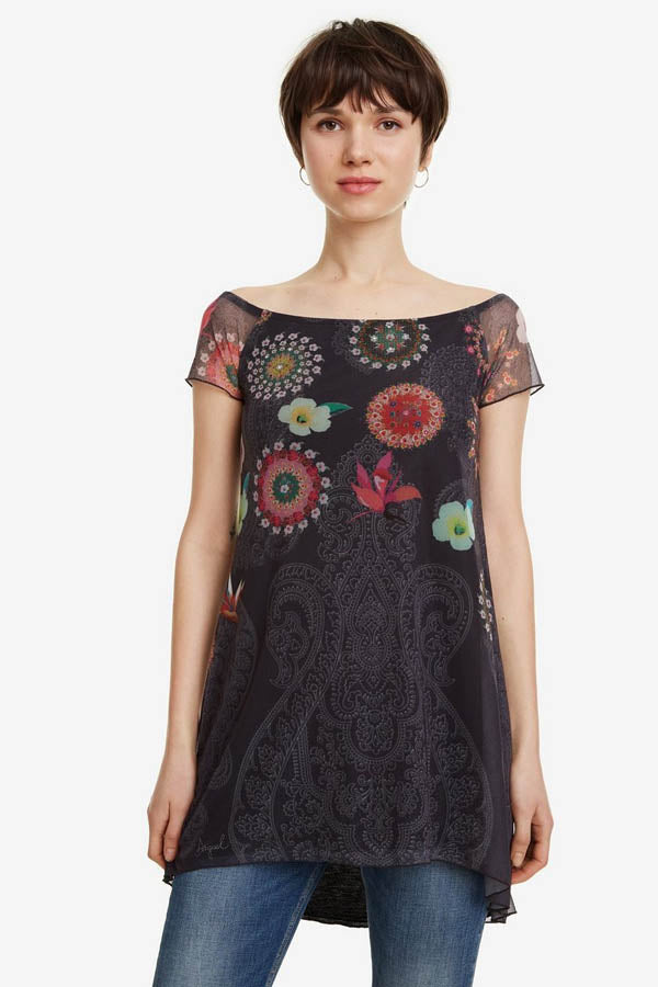 Le t-shirt Desigual nous offre des manches courtes transparentes, un imprimé de mandalas et de fleurs colorés sur le devant, et un col arrondi.