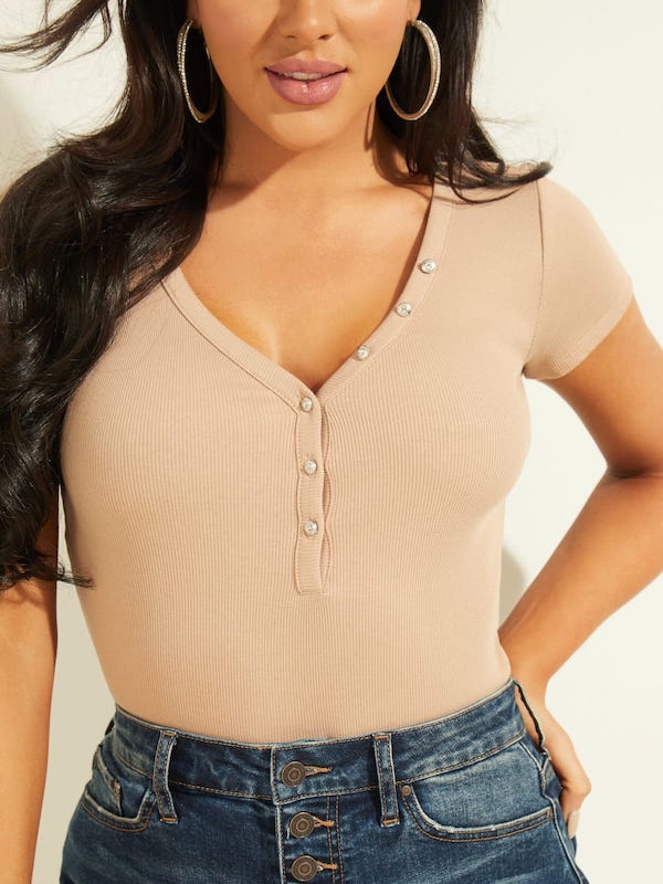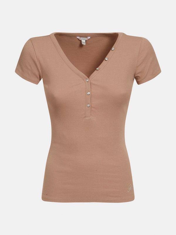 Guess vous présente sont t-shirt slim avec un col en v fermé par des boutons bijoux.