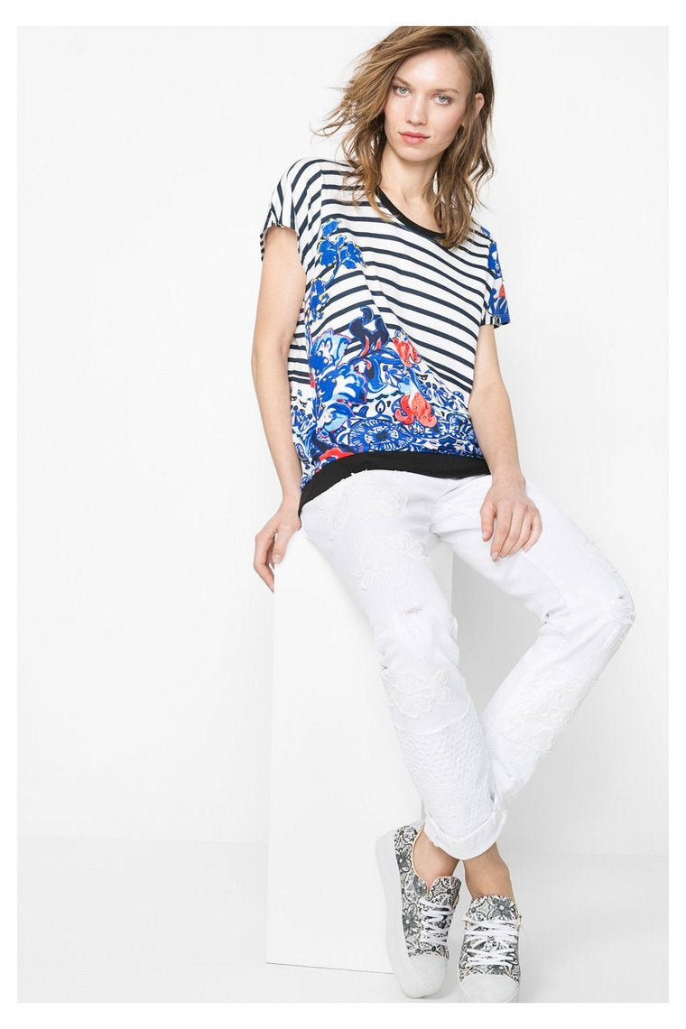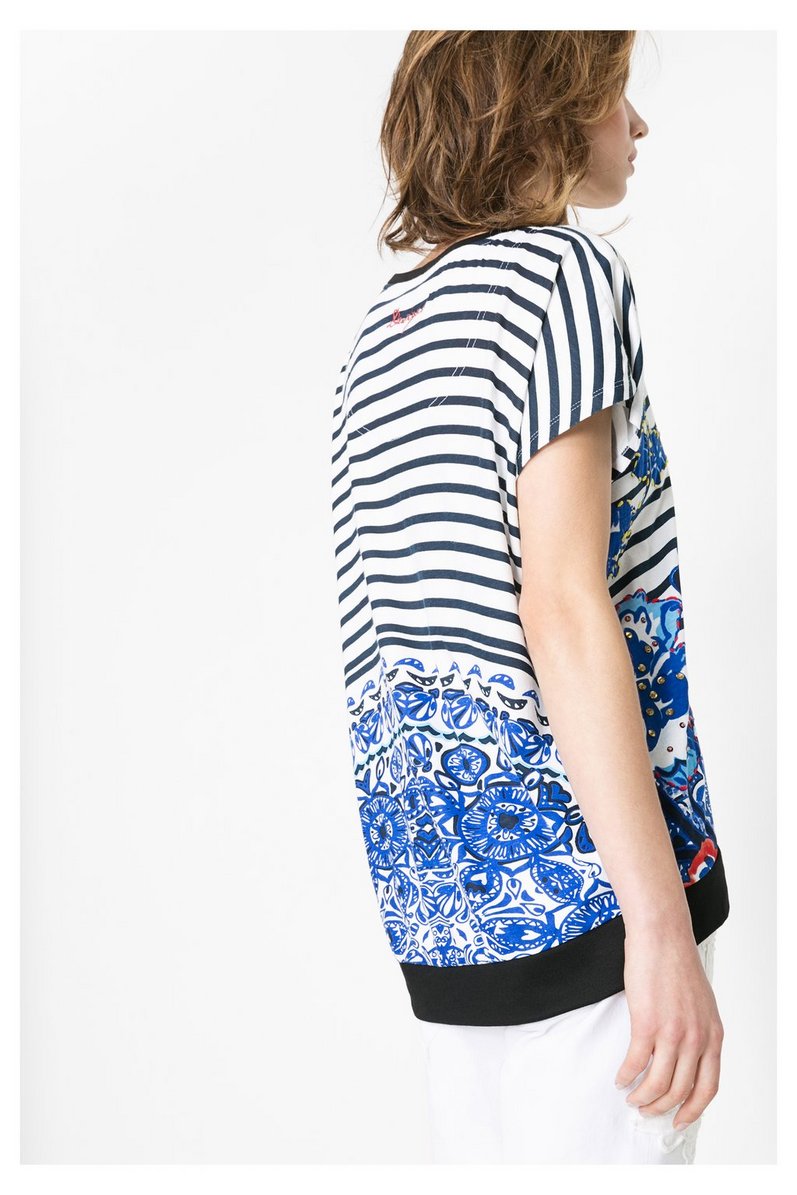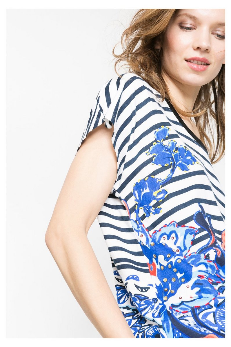 Un jersey coton et viscose écru avec rayures bleu marine et une coupe ample pour le T Shirt Desigual d'autres motifs fleuris bleu électrique,rouge et marine ornés de sequins et perles à partir de la taille.