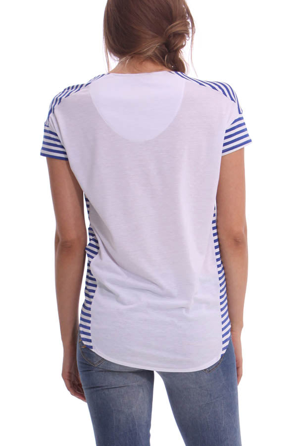 T Shirt Desigual by C Lacroix 41T2L09 Masi. Un jersey fluide et léger blanc pour le T Shirt Desigual by C Lacroix avec un ciel bleu azur et un cadre comme une peinture rétro et moderne à la fois avec un vélo posé contre un mur sur un trottoir, des fleurs et d'autres objets dans de magnifiques couleurs. Des manches courtes avec un imprimé rayé bleu et blanc que vous retrouverez de chaque coté.