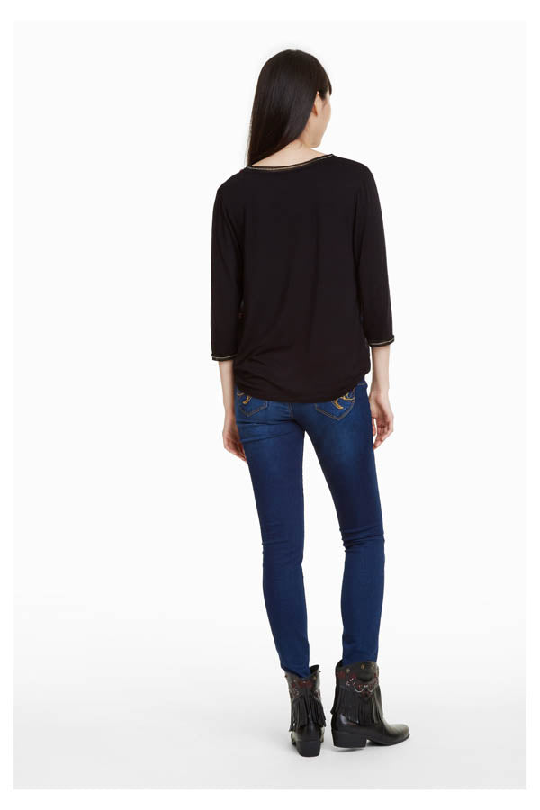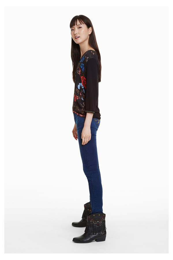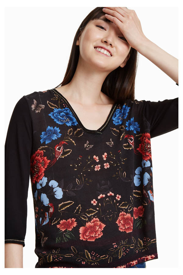 Le t-shirt Desigual possède des manches 3/4, un imprimé fleuri avec du fil doré sur le devant, un col en v et des bas de manches ornés d'un liseré doré,