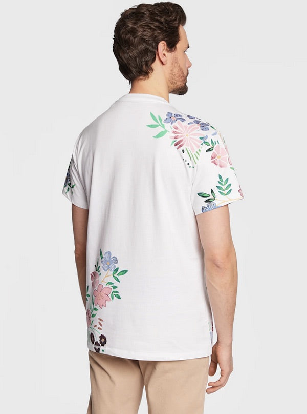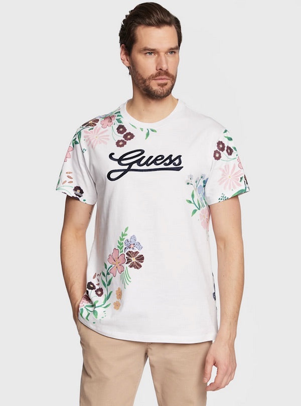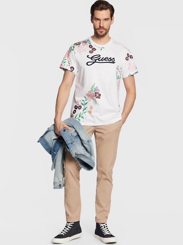Conçu en coton blanc, le t-shirt homme Guess M3GI07 est orné de son logo brodé en contraste et d'un imprimé floral.