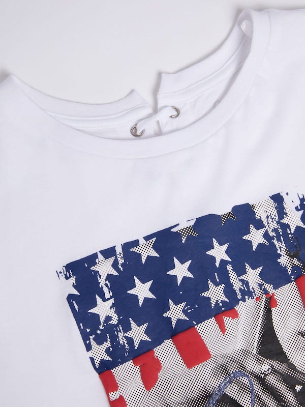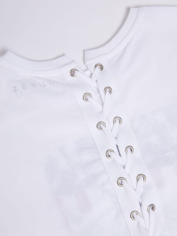 Le t-shirt Guess vous propose un splendide imprimé stylé américain sur le devant et un laçage glamour dans le dos, des manches courtes et un col arrondi.