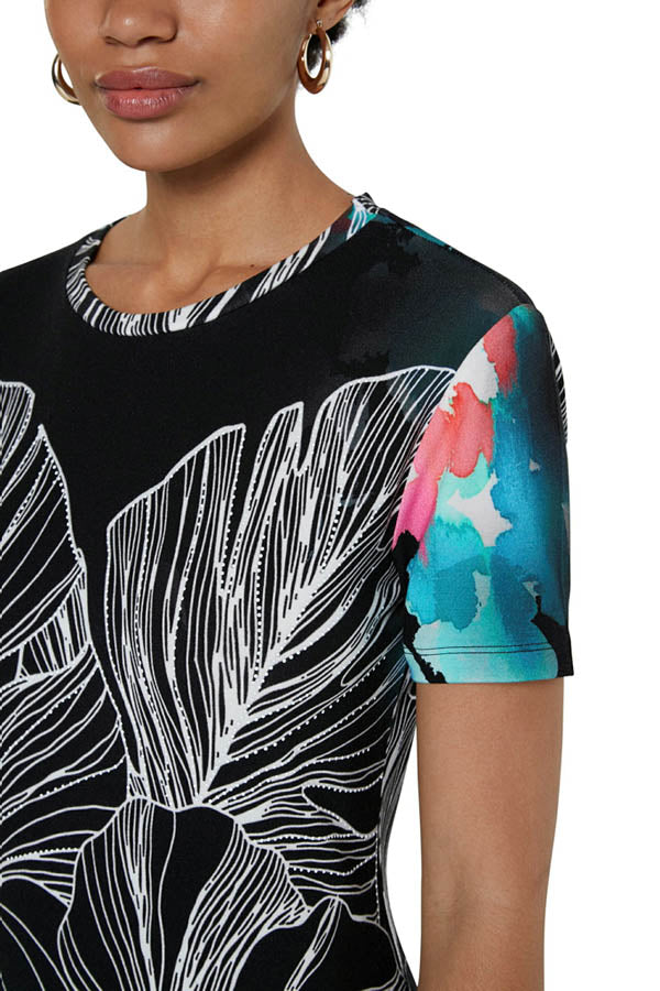 Noir avec imprimé de fleurs contrastantes et colorées aux manches, le t-shirt Desigual est en viscose mélangé.